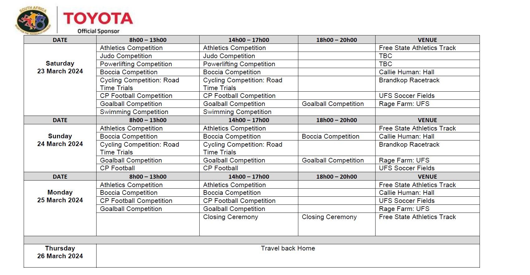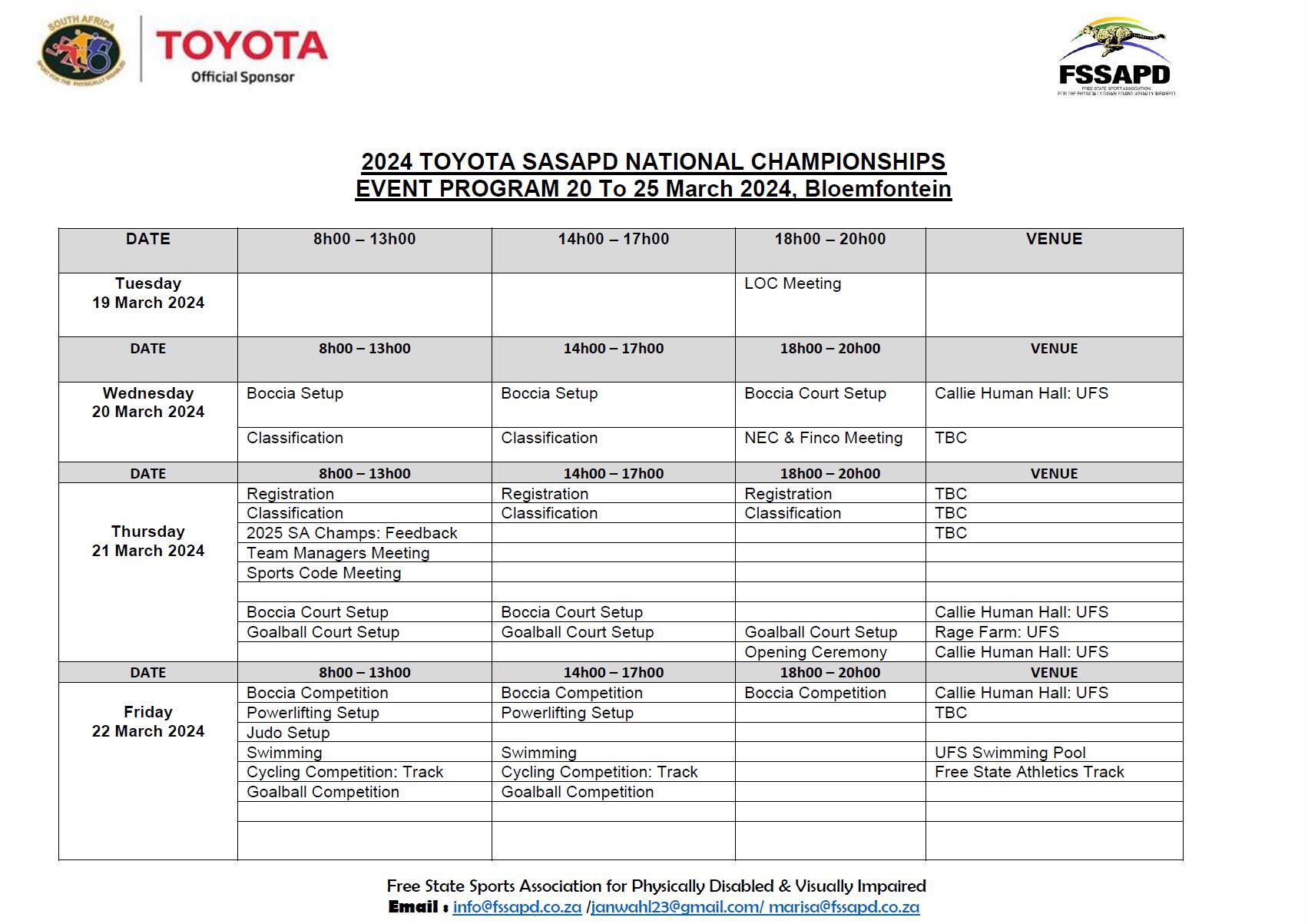 WCSAPD is hosting the 2024 SASAPD Toyota National Championships for the Physically Disabled and Visually Impaired in Bloemfontein from 20 to 25 March 2024